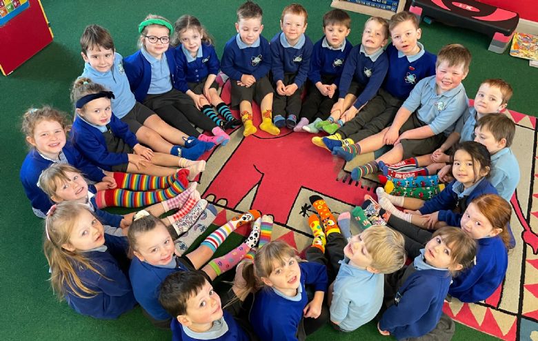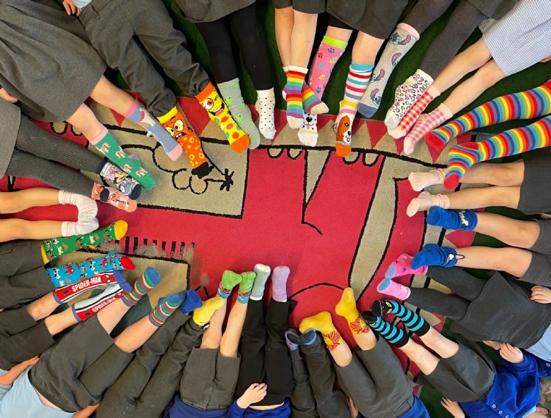 Diwrnod gwisgo sannau lliwgar fel rhan o ddiwrnod Syndrom Down.