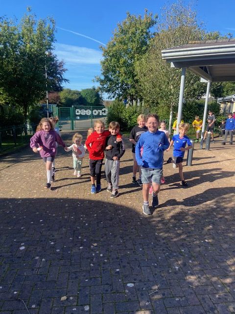 Yr ysgol gyfan yn loncian o gwmpas y pentref wrth gadw'n heini gyda'r llysgenhadon chwaraeon.